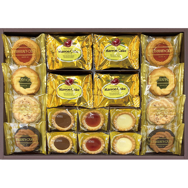 マロンケーキ×4、プチガトー(ストロベリー・ミルクチョコ・ホワイトチョコ)×各2、ロシアケーキ(マカロンストロベリー・フラワーキウイ・リッチビター・ホワイトチョコ)×各2