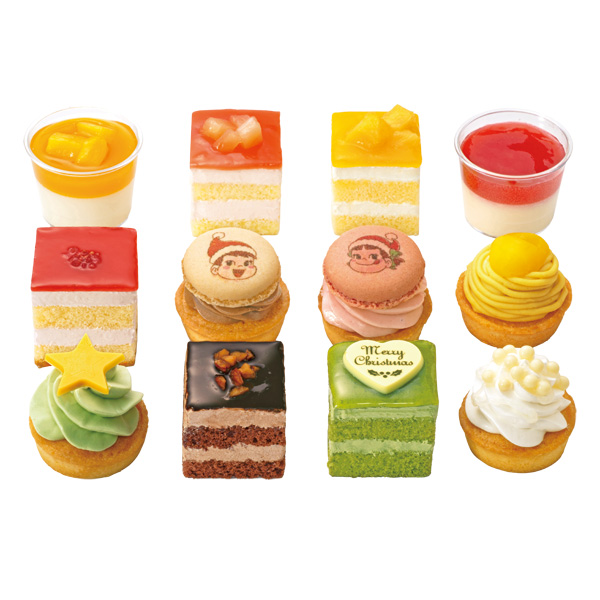 (12個入) 一部に卵・乳成分・小麦・アーモンド・大豆・もも・ゼラチンを含む 消費期限:お渡し日含め2日 12種類のプチサイズのケーキを一度に楽しめるクリスマスパーティに最適なアソートケーキ。タルト、四角いケーキ、カップデザート等、色々な品目のケーキをプチサイズで少しずつ楽しめます。