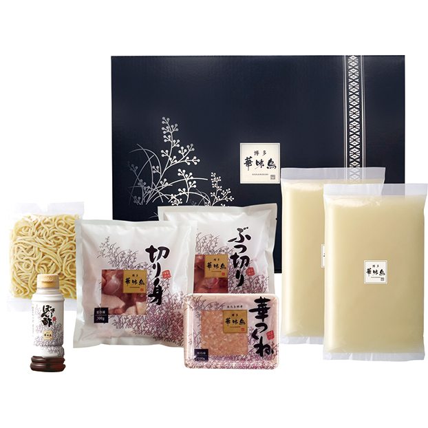 水たきスープ600g×2,華味鳥切り身300g、華味鳥ぶつ切り300g、華つくね200g、博多ぽん酢220ml、ちゃんぽん麺150g