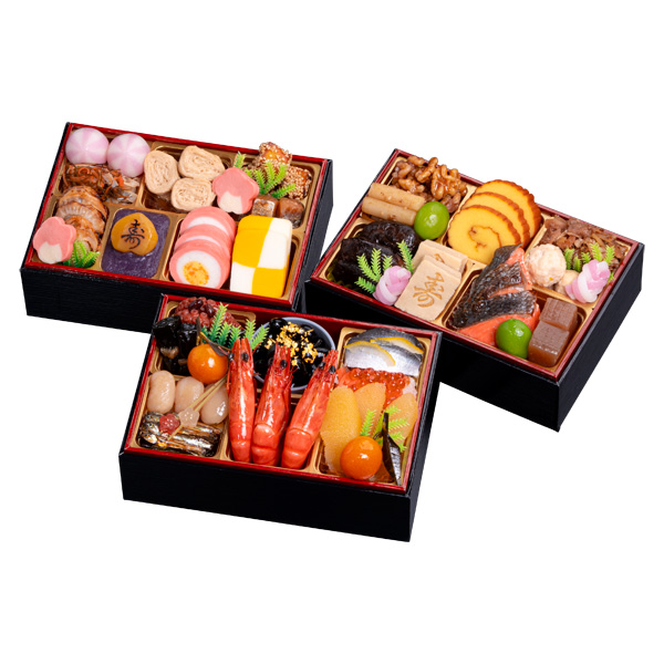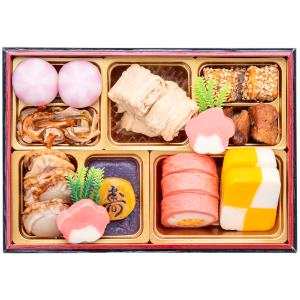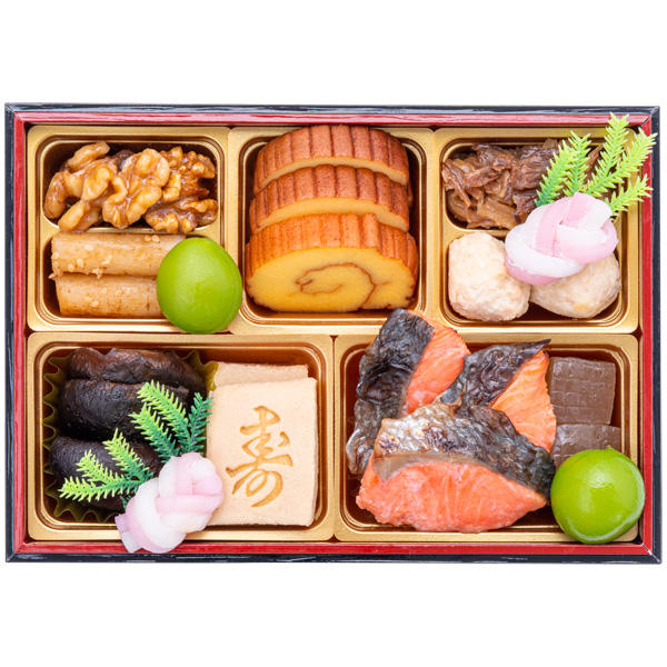 くるみ煮、酢牛蒡、若桃甘露煮、伊達巻、牛肉ごぼう時雨煮、柚子鶏つくね、紅白結び餅、椎茸旨煮、寿高野豆腐、紅鮭白醤油焼、こんにゃく旨煮