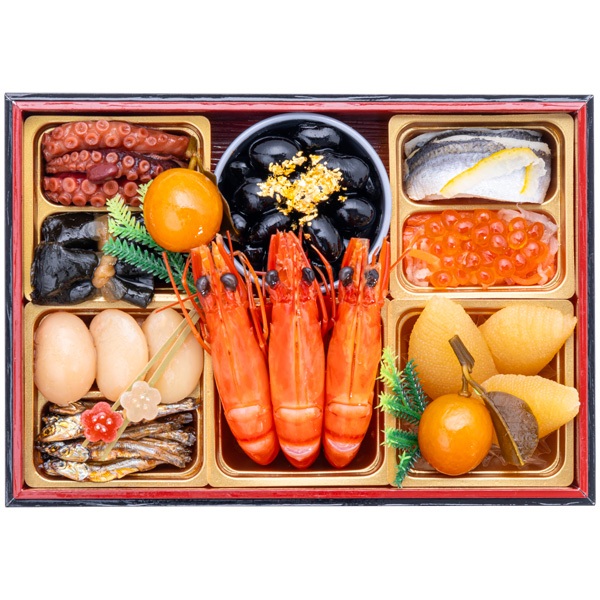 蛸小倉煮、昆布巻、金柑甘露煮、金箔黒豆、ままかり酢漬け柚子風味、紅白なます、いくら醤油漬、白花豆、田作り、祝い海老、数の子鼈甲漬、梅かんざし