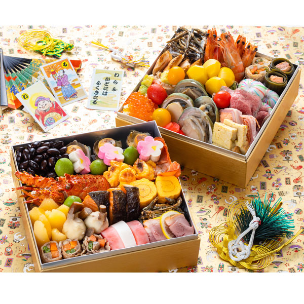 黒豆、さざえ、伊勢海老ロウ焼き、数の子、鮭昆布巻き、本ゆず伊達巻、肉野菜巻き、くわい、田作り、紅白かまぼこ、鴨スモーク、青モモ、梅麩、海老煮物、揚げ野菜巻き、抹茶きんとん、カニ甲羅焼き、手まりもち、鮭幽庵焼き、ゆりねのサラダイクラ添え、海の幸のテリーヌカレー風味、紅白かぶと数の子のマリネ、サーモンテリーヌ、土佐あかうしのローストビーフ、プチトマトコンポート、はちきんスモークとアボカドのマリアージュ、鮑のコンフィー