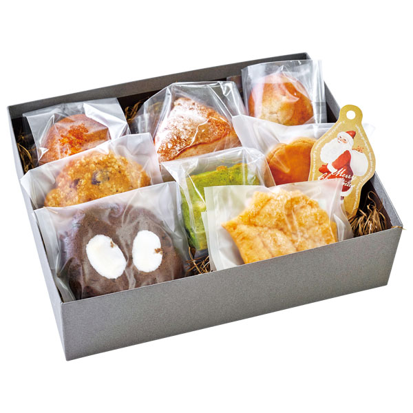 バナナケーキ、ケークロラン・フレーズ、土佐ガモット、ホワイトチョコアメリカンクッキー、ホットココアクッキー、抹茶スコーン、バナナサンド・ラムレーズン、リーフパイのセットです。