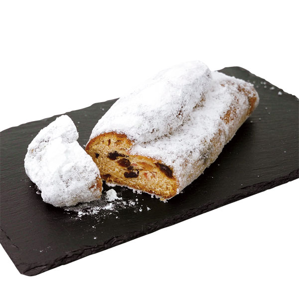 1カ月間洋酒に漬け込んだドライフルーツを小麦粉対比120%生地に練り込み、焼成後、洋酒が生地に溶け込むまでじっくり寝かせた、コミベーカリー特製のシュトレンです。