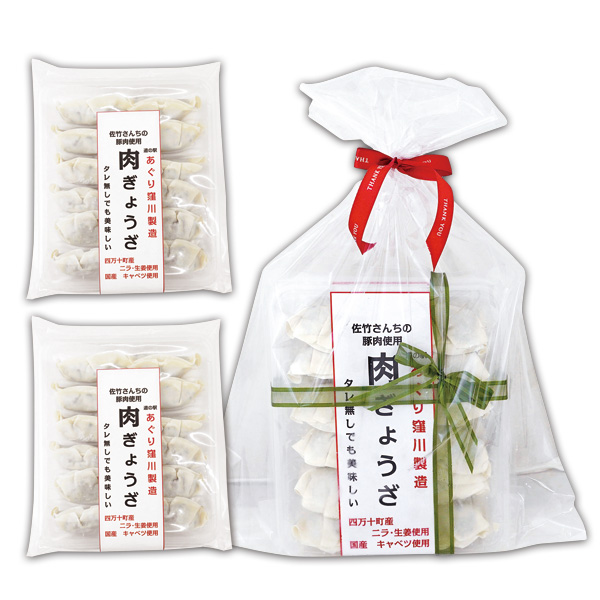 あぐり窪川さんと共同開発しました。四万十ポークの旨味と地場の野菜にこだわり素材本来の味を生かしたぎょうざです。クリスマス使用のラッピングセットです。