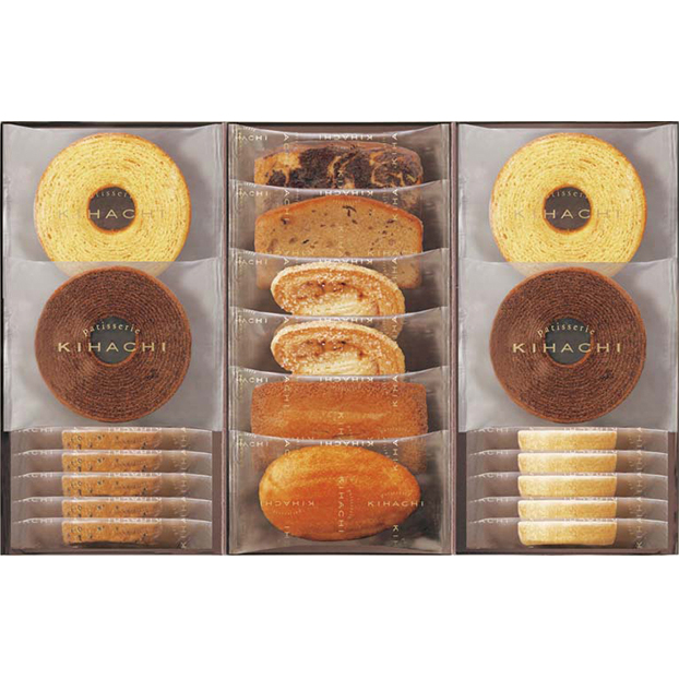 フィナンシェ、はちみつマドレーヌ、マーブルケーク、マロンケーク、パルミエ・バームクーヘン(プレーン・ショコラ)×各2、クッキー(黒胡麻と黒糖・バニラ)×各5