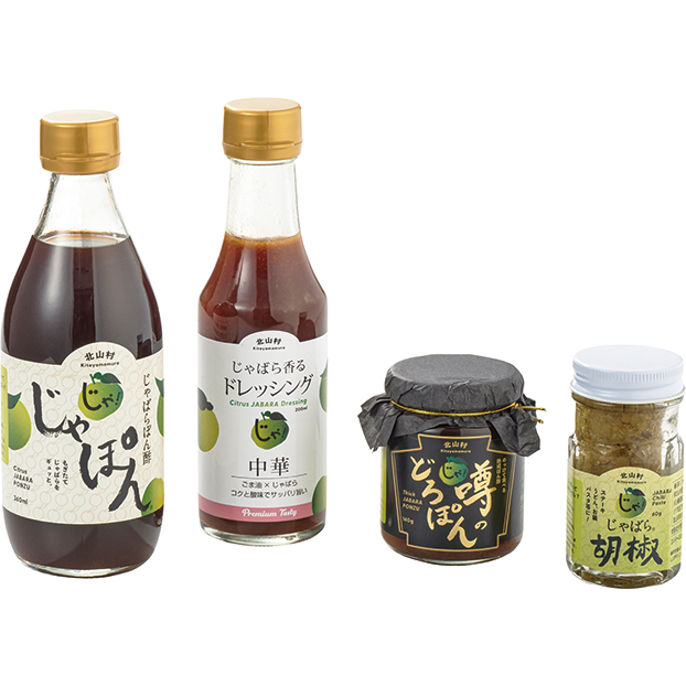 じゃばらぽん酢じゃぽん360ml×1、噂のどろぽん140g×1、じゃばら香る中華ドレッシング200ml×1、じゃばら胡椒60g×1
