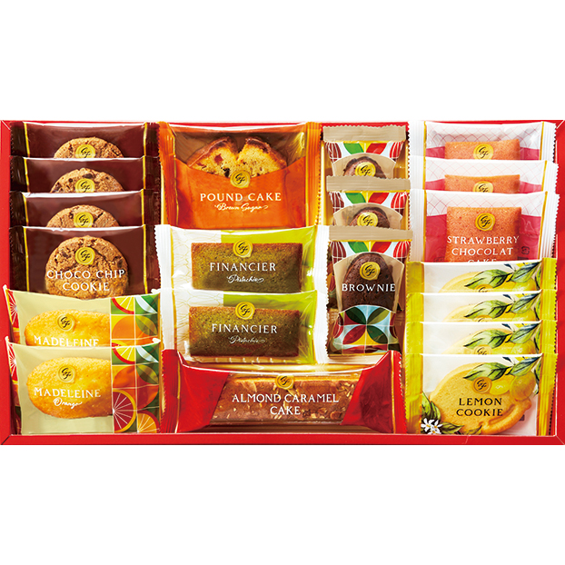 チョコチップクッキー・レモンクッキー×各4、ストロベリーショコラケーキ・ブラウニー×各3、オレンジマドレーヌ・ピスタチオフィナンシェ×各2、ブラウンシュガーパウンドケーキ・アーモンドキャラメルケーキ×各1