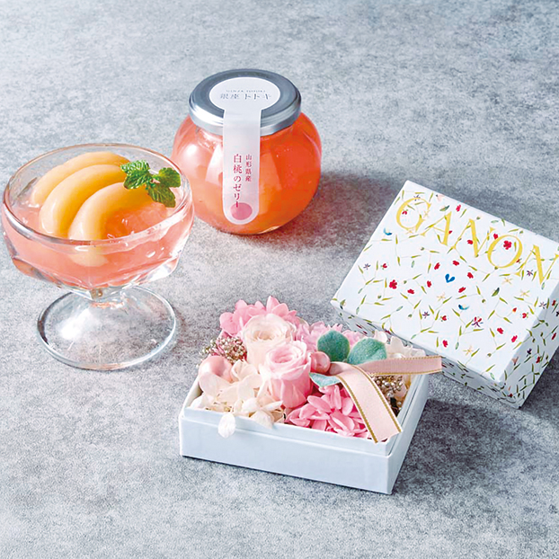 「GANON FLORIST」が監修したプリザーブドフラワーと山形産白桃の入った「銀座トトキ」監修のゼリーをセットでお届け。