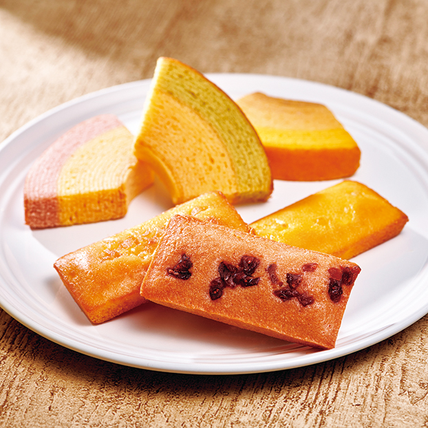 果汁を加えた生地を一層一層丁寧に焼上げたフルーツクーヘンと、フルーツピューレが入った生地を焼上げたフルーツフィナンシェのセット。