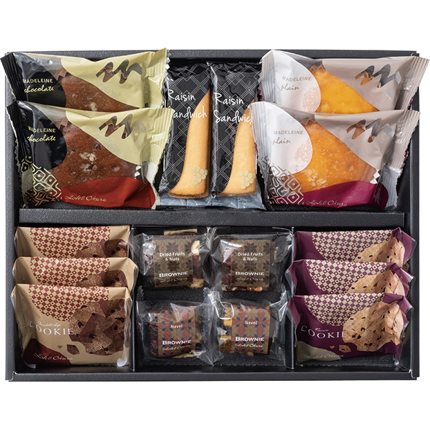 レーズンクッキー・チョコチップクッキー×各3、レーズンサンド・ブラウニー(ネーブル・ドライフルーツ&ナッツ)、マドレーヌ(プレーン・チョコ)×各2
