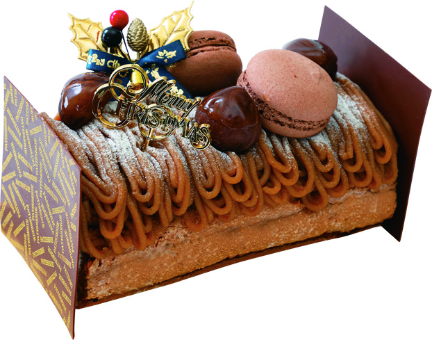 生クリーム・栗ペースト・栗の甘露煮をチョコ生地で巻いたロールケーキに、栗のクリーム・マカロンをのせ仕上げました。生地とクリームの相性抜群の栗たっぷりケーキです。